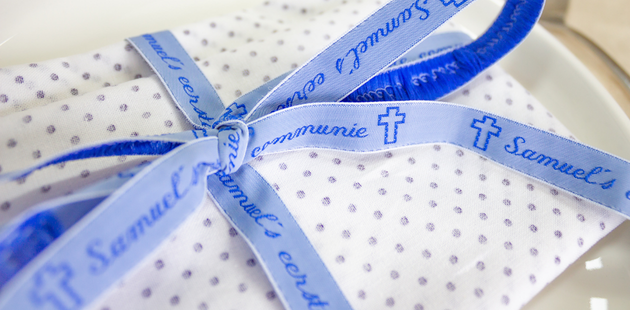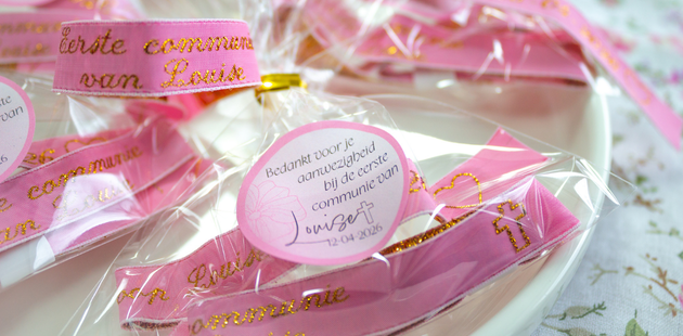 Often it’s the small details that make a communion or baptism truly special. Think of personalized name labels on gifts, a date printed on a beautiful woven text ribbon, or stickers with a personal message. These details bring warmth and character to the celebration, making it an unforgettable day for everyone.