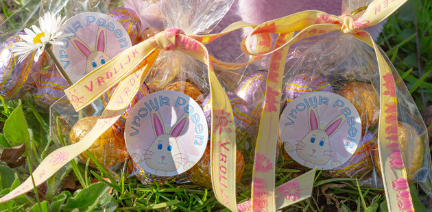 Use small bags or boxes and fill them with Easter eggs. Make them unique with personalized stickers featuring a name or a cute photo. Add a text ribbon to finish the bag beautifully. This way, you create an original and personal Easter treat in no time.